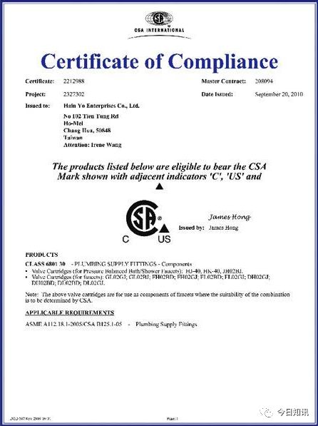 CSA: 是加拿大标准协会(Canadian Standards Association)的简称它成立于1919年,是加拿大首家专为制定工业标准的非盈利性机构。在北美市场上销售的电子、电器等产品都需要取得安全方面的认证。目前CSA是加拿大最大的安全认证机构,也是世界上最著名的安全认证机构之一。它能对机械、建材、电器、电脑设备、办公设备、环保、医疗防火安全、运动及娱乐等方面的所有类型的产品提供安全认证。CSA已为遍布全球的数千厂商提供了认证服务,每年均有上亿个附有CSA标志的产品在北美市场销售。