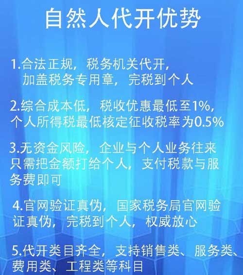 在有税收优惠政策的省市个人代开发出票速度很快,1-3天即可,开出当天就能快递邮寄,对于急需成本票的老板来说省时省力,需要的可以考虑此方法。个人需要承担的税金就是开票额的1.56%(个税核定0.5%、增值税1%,附加税0.06%),纳完即可完税,并且会出具完税证明。接票方公司拿到票后也不用再替自然人代扣代缴个人所得税。代开只能开普票作为企业的成本票,无法进项抵扣。